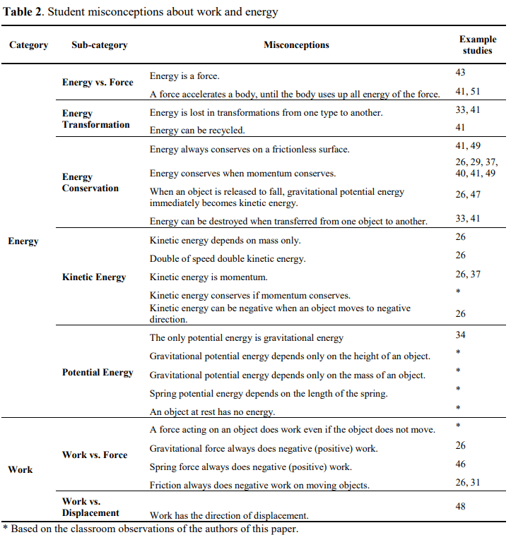 This paper is comprehensive. It compiles what previous researchers have reported and what they found in their engineering students. Liu and Fang listed 23 student misconceptions in work and energy. The authors categorized the misconceptions into those two main ideas, energy and work. Below is a screenshot of the misconceptions listed in the paper.